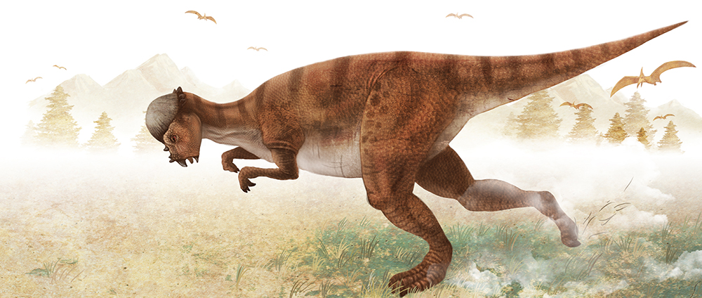 懷俄明腫頭龍?jiān)谄淠X袋上有一個(gè)大大的厚頭蓋骨,出奇地腫厚,形似圓屋頂,頭骨的高度可達(dá)25厘米,而且突出部分是實(shí)心的??茖W(xué)家沒有確定此圓屋頂是否用于用頭撞(人),或是否有什么撞擊能傷害到恐龍。