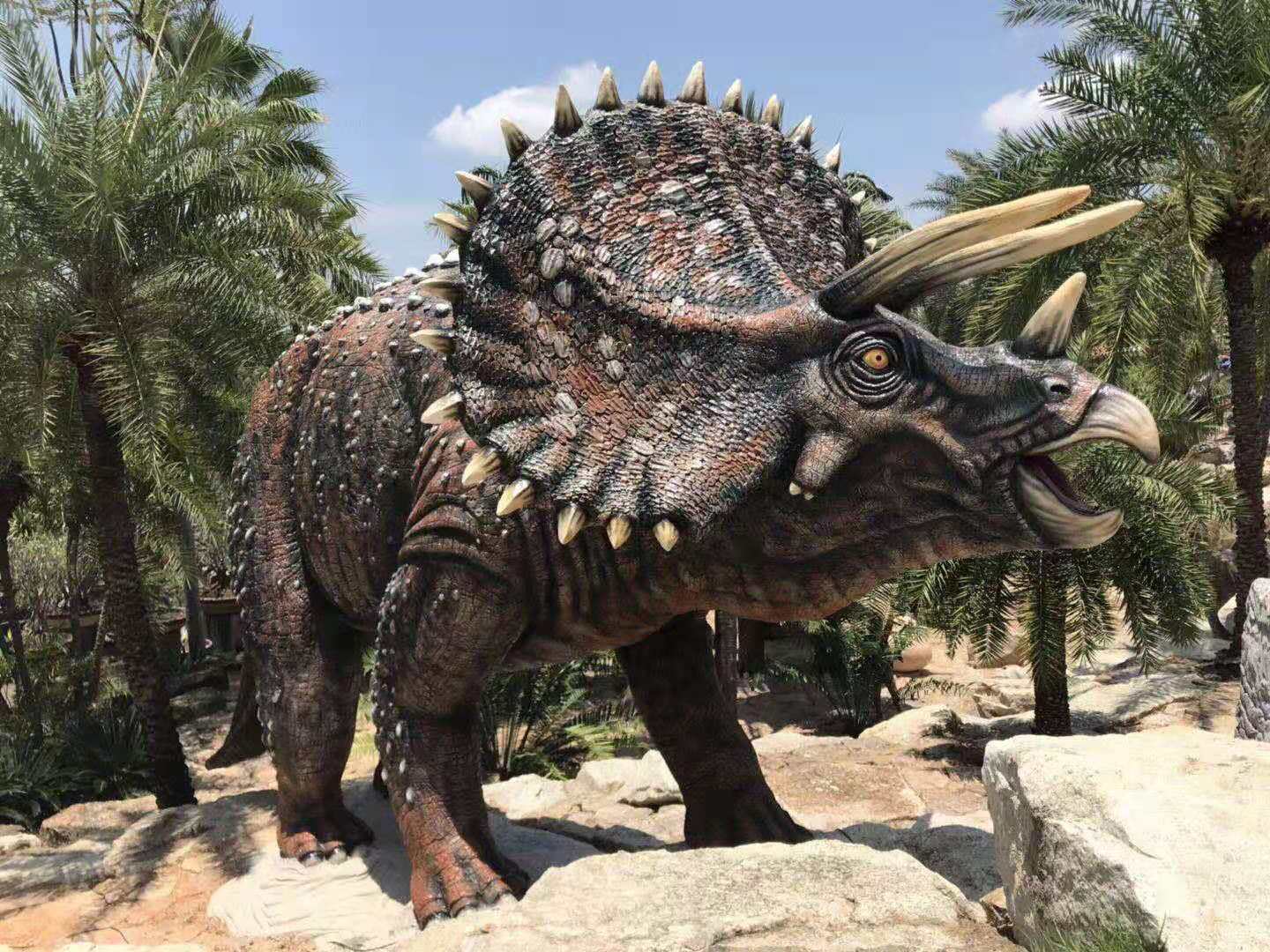 4. 野牛龍(愛氏角龍)野牛龍生活在白堊紀(jì)晚期,大約6 米長、1米高,頭部有三只大角,脖子上有一個(gè)大頸盾,邊緣有齒狀骨質(zhì)突起。它是由山普森(Sampson)在1994年發(fā)現(xiàn)的三個(gè)頭骨化石命名的。像其它角龍一樣,它在獸群中穿行,有牙齒,能咀嚼最硬的植物.