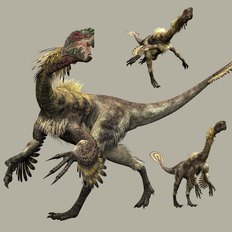 這只世界上所發(fā)現(xiàn)的第一只長有絨狀細(xì)毛的恐龍,被命名為原始中華龍鳥,是一種介于恐龍與鳥類之間的過渡型生物,可能代表了鳥類起源和演化的祖先類型。它擁有一個(gè)大頭顱,樣子與雞相近,前肢短小,后肢長而粗壯;嘴里的銳利牙齒,說明它是一只活躍的掠食者。除了長毛以外,它那條由多達(dá)58節(jié)尾椎骨所組成的特長尾巴,也是一個(gè)重要的特征。它生活在中國的白堊紀(jì)早期,以蜥蜴為生。