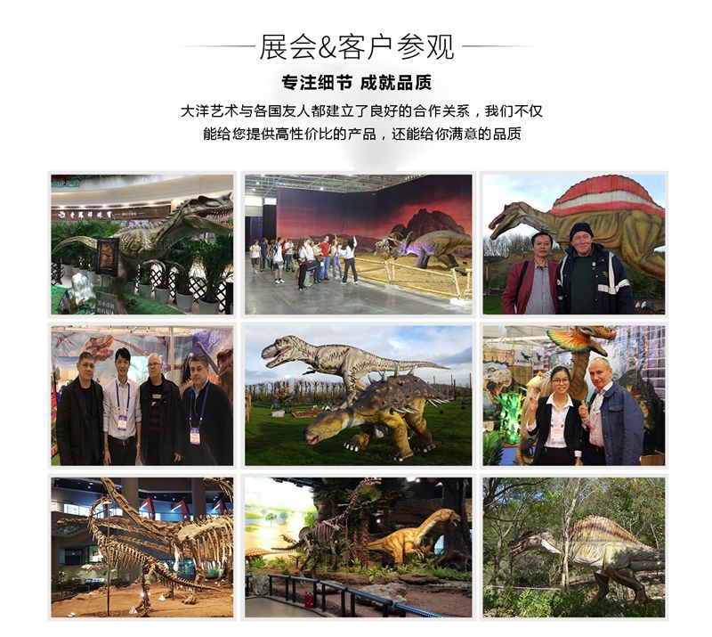 備注:我們所制作的仿真恐龍展品和骨架模型展品被中國科學(xué)院古脊椎所鑒定為“優(yōu)秀科研作品”被譽(yù)為”侏羅紀(jì)“的在現(xiàn)者。我們將秉承客戶至上的理念,為客戶設(shè)計(jì)和制造恐龍展品,并根據(jù)客戶的要求提供3年以上質(zhì)量保證,并長期為客戶提供培訓(xùn)安裝維修人員和配件等售后服務(wù),為顧客解除了恐龍展品長期使用展覽的后顧之憂。